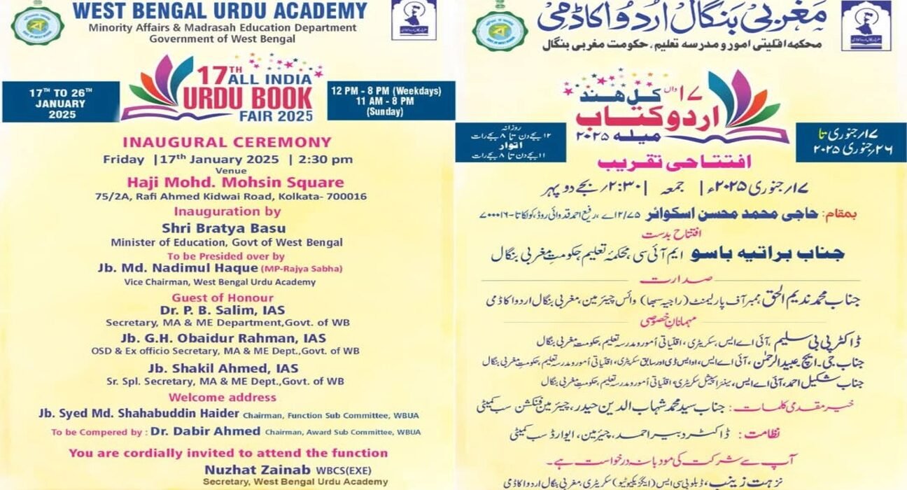 کولکاتا: مغربی بنگال اردو اکیڈمی کے زیر اہتمام اور اقلیتی امور و مدرسہ تعلیم کے تعاون سے 17واں آل انڈیا اردو کتاب میلہ کا آغاز آج 17 جنوری 2025 کو حاجی محمد محسن اسکوائر، رفیع احمد قدوائی روڈ، کولکاتا میں ہوا۔ اس کتاب میلہ کا افتتاح مغربی بنگال کے وزیر تعلیم جناب براتیہ باسو نے کیا۔