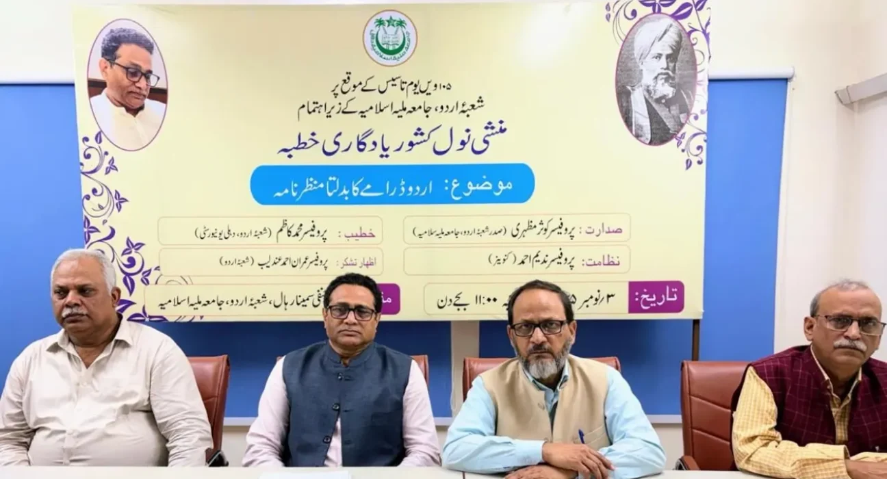 نئی دہلی (۳؍ نومبر): ڈرامے کی داغ بیل دراصل آفرینشِ آدم سے ہی پڑ چکی تھی۔ خدا، عزازیل، آدم اور فرشتے اس کے مرکزی کردار تھے۔ وہاں مکالمہ بھی تھا، کشمکش بھی تھی، ابتدا، ارتقا اور انجام بھی تھا۔ اور یہی عمل اور رد عمل ڈرامے کی اصل روح ہے۔ ڈرامہ صرف حرف و صوت کا میڈیم نہیں، بلکہ خموشی کے وسیلے سے ڈرامہ زیادہ موثر پیامبری کرتا ہے۔ اس کے علاوہ اس کے پاس ترسیل کے لیے تمام بصری، سمعی، صوتی، لونی، حرکی اور غیرملفوظی وسائل موجود ہیں۔ ہندوستان اور یونان ڈرامے کے دو قدیم ترین گہوارے ہیں۔ اردو ڈرامے کے ارتقائی سفر میں لکھنؤ، کولکاتا، ممبئی اور دہلی کا کردار ناقابل فراموش ہے۔ سچ تو یہ ہے کہ ڈرامے نے ہماری تاریخ، تہذیب، سیاست و معاشرت اور ادب و ثقافت کو ہمہ جہت شعور و آگہی سے ثروت مند کیا ہے۔ کہنے کو تو بعد میں فلموں نے ڈراموں کو حاشیے میں ڈال دیا، لیکن فلم کی کمزوری یہ ہے کہ وہ دراصل ہدایت کار کی کٹھ پتلی ہے، جب کہ ڈرامہ بنیادی طور پر اداکاری پر مرکوز ہے اور اداکار ہی ڈرامے کا حقیقی ہیرو اور روحِ رواں ہوتا ہے۔ ان خیالات کا اظہار جامعہ ملیہ اسلامیہ کے ۱۰۵ویں یومِ تاسیس کے موقع پر شعبۂ اردو کے زیرِ اہتمام منعقدہ منشی نول کشور یادگاری خطبہ ارشاد فرماتے ہوئے دہلی یونیورسٹی کے استاذ پروفیسر محمد کاظم نے کیا۔ اس خطبے کے صدر پروفیسر کوثر مظہری نے اپنے صدارتی کلمات میں کہا کہ پروفیسر محمد کاظم ڈرامے کے محقق اور ناقد ہی نہیں بلکہ ان کا تعلق اسٹیج ڈرامے کی ہدایت کاری اور اداکاری سے بھی ہے۔ انھوں نے پروفیسر محمد کاظم کو مبارک باد پیش کرتے ہوئے کہا کہ یہ خطبہ نہایت فکرانگیز اور بلیغ تھا۔ انھوں نے اس مسئلے پر تشویش کا بھی اظہار کیا کہ آج کل اردو میں اول تو ڈرامے بہت کم لکھے جا رہے ہیں اور جو کچھ لکھے بھی جا رہے ہیں، ان کی زبان اس قدر مستحکم نہیں ہے، جو ہمارے اردو ڈراموں کی شناخت رہی ہے۔