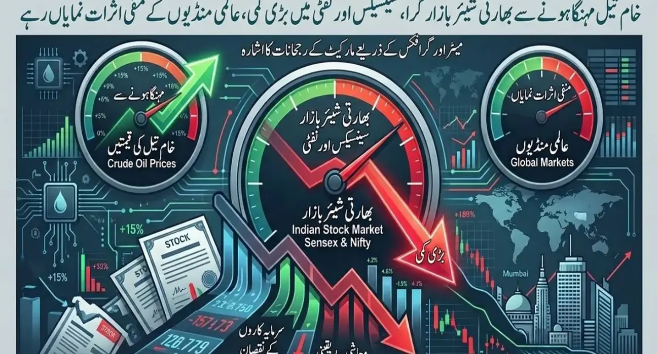 بھارت کے شیئر بازار میں جمعرات کے روز زبردست گراوٹ دیکھنے میں آئی، جس سے سرمایہ کاروں میں تشویش کی لہر دوڑ گئی۔ کاروباری دن کے اختتام پر سینسیکس تقریباً 3.26 فیصد کمی کے ساتھ 2,496 پوائنٹس گر کر 74,207 کی سطح پر بند ہوا، جبکہ نفٹی بھی اسی تناسب سے 775 پوائنٹس نیچے آ کر 23,002 پر آ گیا۔ دن کے دوران ایک وقت ایسا بھی آیا جب مارکیٹ میں مزید شدید دباؤ دیکھنے کو ملا اور سینسیکس تقریباً 2,527 پوائنٹس تک نیچے چلا گیا تھا، جبکہ نفٹی بھی 790 پوائنٹس تک گر گیا تھا، تاہم اختتامی لمحات میں کچھ حد تک بہتری دیکھی گئی۔ماہرین کے مطابق اس گراوٹ کی ایک بڑی وجہ عالمی سطح پر خام تیل کی قیمتوں میں اچانک اضافہ ہے۔ خاص طور پر ایران کے اہم گیس اور تیل کے منصوبے، ساؤتھ پارس گیس فیلڈ، پر حملے کی خبر کے بعد عالمی منڈی میں تیل کی قیمتیں تیزی سے اوپر گئیں۔ چونکہ بھارت تیل کا بڑا درآمد کنندہ ملک ہے، اس لیے قیمتوں میں اضافہ براہِ راست ملکی معیشت اور سرمایہ کاروں کے اعتماد پر اثر انداز ہوتا ہے، جس کا نتیجہ اسٹاک مارکیٹ میں مندی کی صورت میں سامنے آیا۔