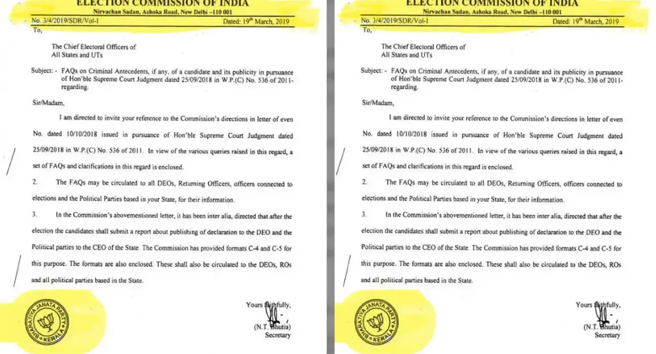 کیرل میں الیکشن کمیشن کے خط پر بی جے پی مہر، وضاحت میں دفتری غلطی قرار، اپوزیشن نے غیر جانبداری پر سوال اٹھائے.