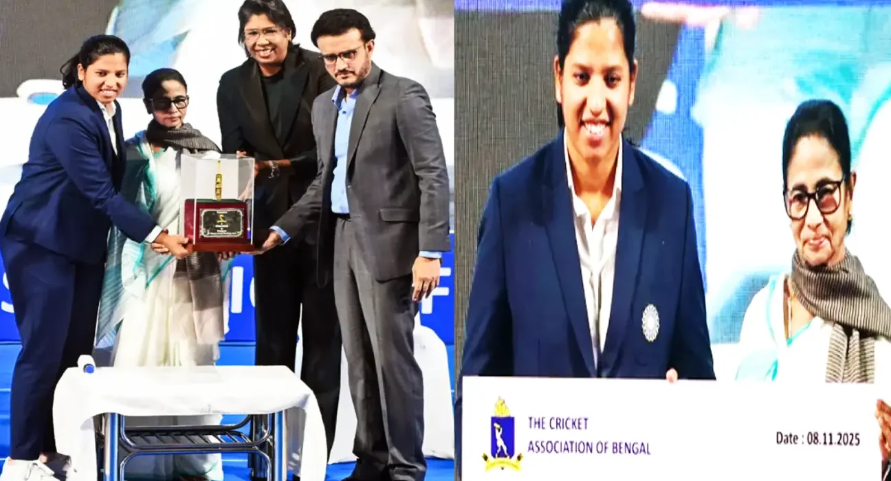کلکتہ کے تاریخی ایڈن گارڈنز میں ہفتہ کے روز ایک پروقار تقریب منعقد ہوئی جس میں مغربی بنگال کی وزیراعلیٰ ممتا بینرجی، سابق بھارتی کرکٹ کپتان سوربھ گنگولی، خاتون کرکٹ ٹیم کی سابق کپتان جھولن گوسوامی اور کرکٹ ایسوسی ایشن آف بنگال (سی اے بی) کے اعلیٰ عہدیداران نے شرکت کی۔ اس تقریب کا مقصد بھارتی خاتون کرکٹ ٹیم کی نمایاں کھلاڑی رِچا گھوش کی شاندار کارکردگی کو سراہنا تھا۔تقریب کے دوران وزیراعلیٰ ممتا بینرجی اور سوربھ گنگولی نے مشترکہ طور پر اس امید کا اظہار کیا کہ ’’ایک دن رِچا گھوش بھارتی خواتین کرکٹ ٹیم کی قیادت کریں گی۔‘‘ رِچا کو ان کی بہترین کارکردگی کے اعتراف میں 34 لاکھ روپے کا چیک پیش کیا گیا۔ اس موقع پر سوربھ گنگولی نے کہا کہ ’’رِچا نے فائنل میچ میں 34 رنز بنائے تھے، اسی مناسبت سے انہیں 34 لاکھ روپے دینے کا فیصلہ کیا گیا ہے۔‘‘ سی اے بی کی جانب سے رِچا کو سونے کا بیٹ اور بال بھی بطور اعزاز پیش کیا گیا۔