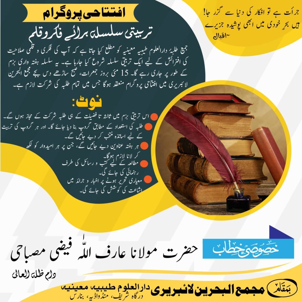 15 مئی 2025 بروز جمعرات، صبح ساڑھے دس بجے” مجمع البحرین لائبریری” کے وسیع و عریض ہال میں اس سلسلے کا افتتاحی پروگرام منعقد ہوا۔ پروگرام کی ابتدا تلاوت کلام ربانی سے شعبہ قرأت خصوصی کے طالب علم محمد رضا نے کی۔ پھر درجہ رابعہ کے طالب علم محمد ساجد رضا نے نعت پاک کے اشعار سے مجلس کو نغمہ زار کیا۔ اس کے بعد تمہیدی کلمات پیش کرنے کے لیے مولانا ابرار رضا مصباحی(آسی فاؤنڈیشن) روبرو ہوۓ۔ انہوں نے اپنے بیان میں قلم کی اہمیت و افادیت پر بھر پور روشنی ڈالی اور طلبہ کے جذبہ و لگن کو مہمیز کیا۔ پھر ادیب شہیر حضرت علامہ عارف اللّٰہ فیضی مصباحی صاحب قبلہ (شیخ الحدیث دارالعلوم طیبیہ معینیہ) کاخصوصی خطاب ہوا۔ حضرت فیضی صاحب نے قرآن و حدیث اور تاریخ کی روشنی میں علم اور حصول علم کے لیے جادہ پیمائی پر خوبصورت اور دلنشین اسلوب میں بہت معلوماتی گفتگو فرمائی۔ الفاظ و معانی کی شوکت، سلاست و روانی کی چاشنی، آیات و احادیث کی دقیقہ سنجی کے عناصر نے پورے خطاب میں رنگ بھر دیے۔ ان کے بیان کا خلاصہ یہ تھا کہ علم سے ہی فضیلت و برتری حاصل ہوتی ہے۔ اور حصول علم کے لیے مطالعہ کتب ناگزیر ہے۔ پھر حاصل کردہ علم کی اشاعت کے لیے قلم کی اہمیت و افادیت مسلم ہے۔ اور قرطاس و قلم میں زود افزونی کے لیے بھی مطالعہ و ممارست سنگ میل سے کم نہیں۔ دنیا میں تخلیق (Creation) کے جتنے شعبے ہیں، سب میں انسانی ذہن کی نادرہ کاری کے کرشمے بکھرے پڑے ہیں۔ جب تک فکر و خیال میں وسعت و ندرت کا عنصر نہیں پیدا ہوگا ایک شاندار نثر یا نظم بھی معرض وجود میں نہیں آسکتا۔ اور فکر و خیال میں بلندی کا شجر تبھی نمویاب ہوگا جب مطالعہ کی عادت بن جاۓ گی۔ اخیر میں ادارے کے مؤقر استاذ حضرت مفتی سید فاروق مصباحی صاحب قبلہ نے طلبہ کو نصیحت کرتے ہوئے فرمایا کہ دنیا کے سپید و سیاہ میں آج انہیں لوگوں کا قبضہ ہے جن کے ہاتھوں میں قلم ہے۔ اس لیے آج کے اس پرفتن دور میں جب کہ اسلام مخالف طاقتیں برسر پیکار ہیں، ہمیں ہر طور پر دفاعی اور تبلیغی پوزیشن سنبھالنے کی کوشش کرنی چاہیے۔ اور حقانیت و صداقت کو واشگاف کرنے کے لیے اپنی فکر و قلمی استعداد کو پروان چڑھانا چاہیے۔ جب ہاتھ میں قلم آجاۓ تو ہمیشہ سچ لکھنے کو لازم پکڑیے۔ تعلیم و تربیت کی یہ خوشگوار مجلس حضرت سید صاحب قبلہ کے بیان اور دعا پر ختم ہوئی۔ اور کثیر طلبہ نے دلچسپی کا مظاہرہ کرتے ہوئے تربیتی بزم میں شرکت کے لیے اپنے اسما درج کراۓ۔ اس موقع پر دارالعلوم طیبیہ معینیہ کے پرنسپل مولانا عبدالسلام رشیدی کی دعائیں اور محبتیں شامل کار رہیں۔ اور اساتذہ میں مولانا سبیل رضا مصباحی، مفتی حسنین رضا مصباحی، مولانا شہروز عالم مصباحی، مفتی سید عمران مصباحی، مولانا ارسلان احمد مصباحی، مولانا قاری ظفر العلی نعیمی، حافظ مجیب الرحمٰن برکاتی، حافط شہنواز طیبی، ماسٹر مظہر طیبی، ماسٹر سنتوش کمار اور نشاط اختر رومی مصباحی مجلس کی رونق بنے رہے۔