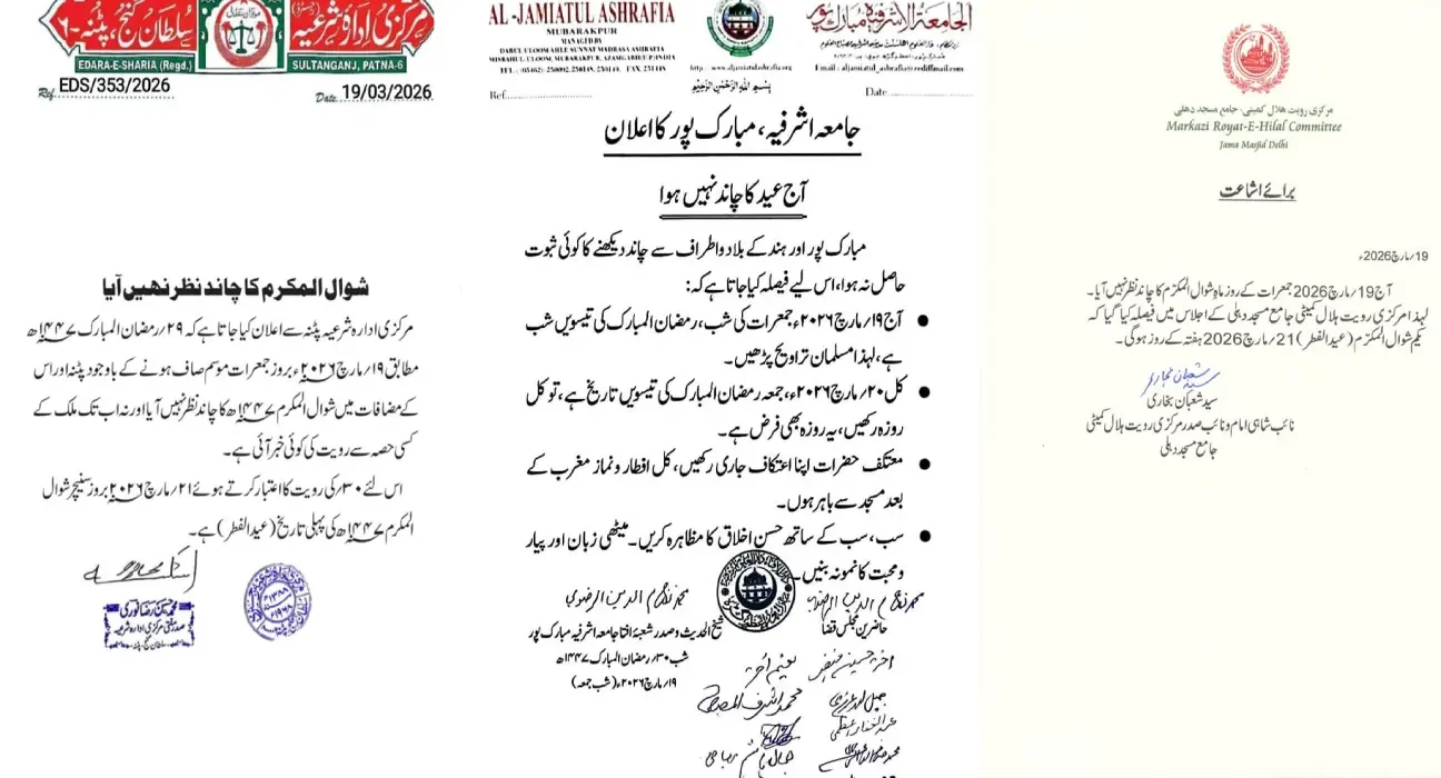 نئی دہلی اور ملک کے دیگر حصوں میں مرکزی رویتِ ہلال کمیٹیوں نے باضابطہ اعلان کیا ہے کہ عید الفطر ہفتہ، 21 مارچ 2026 کو منائی جائے گی۔ یہ فیصلہ شوال المکرم کا چاند نظر نہ آنے کے بعد کیا گیا۔ جمعرات، 19 مارچ 2026 کو متعدد مقامات پر چاند دیکھنے کی کوشش کی گئی، تاہم کہیں سے بھی چاند نظر آنے کی مستند شہادت موصول نہیں ہو سکی۔ اسی بنیاد پر علماء اور مفتیانِ کرام نے متفقہ طور پر یہ فیصلہ کیا کہ رمضان المبارک کے روزے 30 مکمل کیے جائیں گے اور یکم شوال 21 مارچ بروز ہفتہ کو ہوگی۔