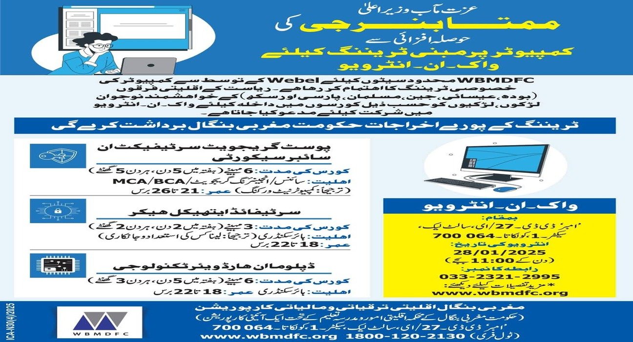 خبرنامہ مغربی بنگال حکومت کا اقلیتی نوجوانوں کے لیے کمپیوٹر ٹریننگ... admin@alnoortimes.in جنوری 22, 2025 کلکتہ،بنگال کلکتہ: مغربی بنگال حکومت کے زیرِ اہتمام ویبیل (Webel) اور ویب ایم ڈی ایف سی (WBMDFC) کی جانب سے...