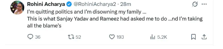 بہار اسمبلی انتخابات کے نتائج میں مہاگٹھ بندھن کی بھاری ناکامی نے اس اتحاد کی جماعتوں پر اپنا اثر واضح طور پر دکھانا شروع کر دیا ہے۔ اس شکست کے ساتھ ہی لالو پرساد یادو کے خاندان کے اندر چل رہی کشیدگی بھی تیزی سے باہر آنے لگی ہے۔ ہفتے کے روز لالو یادو کی بیٹی روہنی آچاریہ نے سوشل میڈیا پر ایک بیان جاری کیا، جس میں انہوں نے کہا کہ وہ تمام تر ذمے داری اپنے سر لے رہی ہیں۔ اپنے اسی پیغام میں انہوں نے سنجے یادو اور رمیض کا بھی ذکر کیا، جس کے بعد آر جے ڈی کے اندرونی اختلافات مزید گہرے ہونے کے امکانات بڑھ گئے ہیں۔روہنی آچاریہ نے اپنے بیان میں لکھا کہ وہ سیاست چھوڑ رہی ہیں اور اپنے گھرانے سے بھی دوری اختیار کر رہی ہیں۔ ان کے مطابق جو کچھ انہیں سنجے یادو اور رمیض کی جانب سے کرنے کو کہا گیا، وہ وہی کر رہی ہیں۔ انہوں نے یہ بھی کہا کہ وہ ساری غلطیوں اور حالات کی ذمے داری قبول کرتی ہیں۔