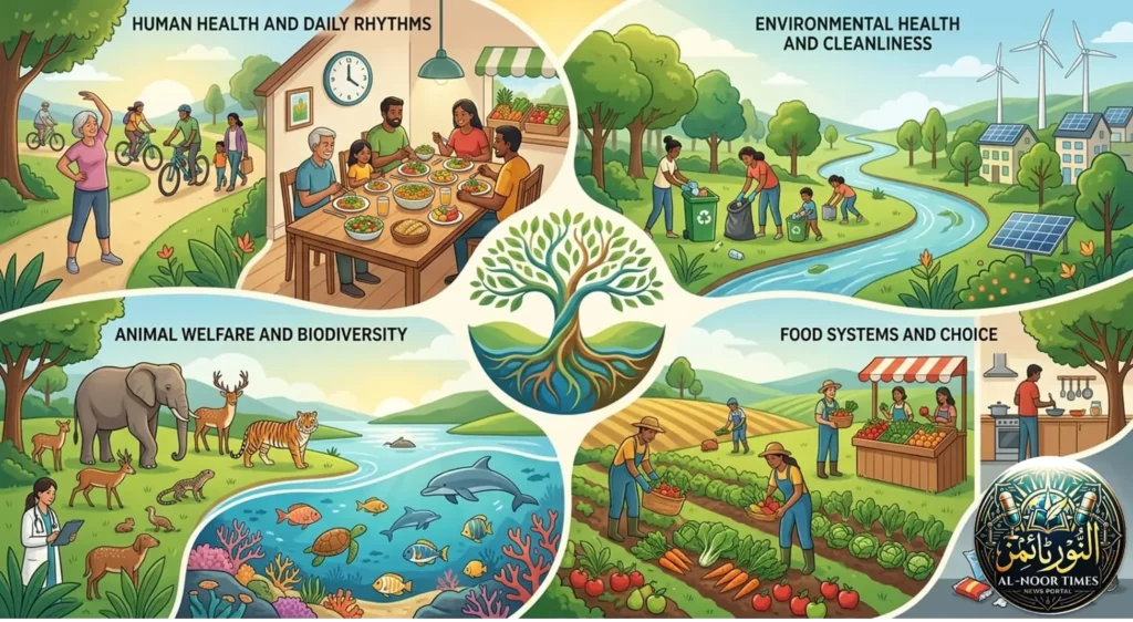 یہ بات بھی قابل غور ہے کہ جب ہم صحت مند معاشرے کی بات کرتے ہیں تو اس کا مطلب صرف انسان کی صحت نہیں بلکہ ماحول، جانوروں اور دیگر جانداروں کی صحت بھی شامل ہوتی ہے۔ ایک صاف اور صحت مند ماحول ہماری زندگی کے لیے نہایت ضروری ہے۔ ہمیں چاہیے کہ اپنے اردگرد صفائی کا خاص خیال رکھیں اور ایسی اشیاکے استعمال سے بچیں جو آلودگی کا باعث بنتی ہیں۔ صاف اور محفوظ پانی کا استعمال بھی بے حد ضروری ہے کیوں کہ آلودہ پانی متعدد بیماریوں کا سبب بنتا ہے۔اسی طرح متوازن غذا صحت کے لیے بنیادی حیثیت رکھتی ہے۔ ہمیں چاہیے کہ وقت پر کھانا کھائیں، صحت بخش غذا کا انتخاب کریں اور فاسٹ فوڈ سے حتیٰ الامکان پرہیز کریں۔ گھریلو کھانے کو ترجیح دیں کیوں کہ یہ زیادہ محفوظ اور صحت بخش ہوتا ہے۔ کھانا بنانے کے لیے مٹی یا دیگر محفوظ برتنوں کا استعمال کریں۔ پلاسٹک کے برتنوں سے حتیٰ الامکان اجتناب کریں کیوں کہ یہ ہماری صحت اور ماحول دونوں کے لیے نقصان دہ ہیں۔