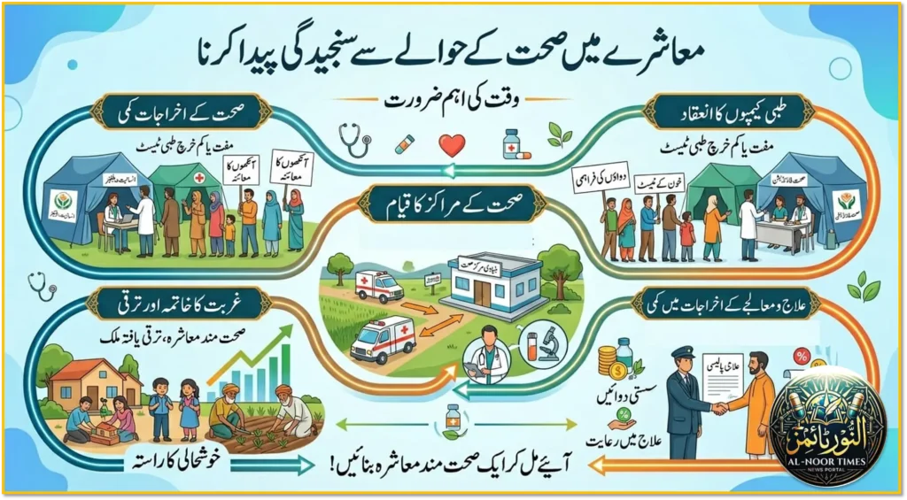 معاشرے میں صحت کے حوالے سے سنجیدگی پیدا کرنا وقت کی اہم ضرورت ہے۔ مختلف اداروں اور تنظیموں کو چاہیے کہ مفت یا کم خرچ طبی کیمپوں کا انعقاد کریں۔ایسے علاقے جہاں سے اسپتال کافی دور ہے وہاں صحت کے مراکز قائم کریں۔ حکومت کو بھی چاہیے کہ علاج معالجے کے اخراجات کو کم کرنے کے لیے مؤثر پالیسیاں بنائے اور ادویات و ٹیسٹوں کی قیمتوں کو قابو میں رکھے۔خوراک میں ملاوٹ کے خلاف سخت کارروائی ہونی چاہیے کیوں کہ یہ عوامی صحت کے لیے ایک بڑا خطرہ ہے۔